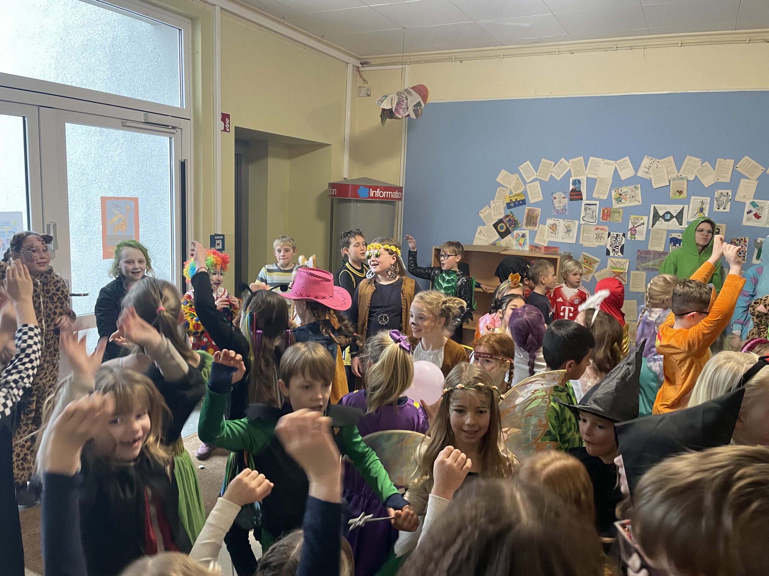 Den gemeinsamen Abschluss bildete eine kurze Feierzeit mit allen Kindern. In einer langen Polonäse zog die Schulgemeinschaft durch das gesamte Gebäude. Anschließend trafen sich alle zu einem gemeinsamen Tanz – ein stimmungsvoller und verbindender Ausklang eines gelungenen Karnevalstages.