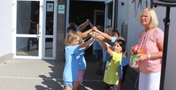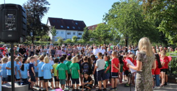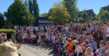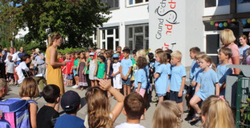 Anschließend ging es auf dem Schulhof der Grundschule weiter. Die Kinder der zweiten Klassen haben die neuen Schulkinder mit dem Lied „Herzlich willkommen, ihr lieben Leute“ in der Schule begrüßt. Nach der offiziellen Begrüßung unserer kommissarischen Konrektorin Sabine Sommerfeld ging es dann noch für die erste gemeinsame Schulstunde mit den KlassenlehrerInnen in den Klassenraum und die Eltern konnten sich beim Elternkaffee austauschen und ein wenig entspannen.