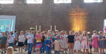 Im Einschulungsgottesdienst konnten die Kinder ihre musikalischen Fähigkeiten ausprobieren. Die Geschichte „Pudel, Pauken und ein Plan“ wurde mit gemeinsamen Liedern und kleinen Mitmachaktionen gestaltet. Die Klasse 3b hat uns als Chor professionell durch den gesamten Gottesdienst begleitet.