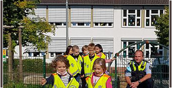 Aber auch die Schulkinder, – und allen voran die Erstklässler-, müssen wissen, wie sie sich sicher auf ihrem Schulweg verhalten. Dafür kam in dieser Woche der Beamte der Kreispolizei, Herr Schelenhaus zu uns in die Schule, um mit unseren „Igeln“ zu üben, wie sie sicher zur Schule und wieder zurück nach Hause kommen.