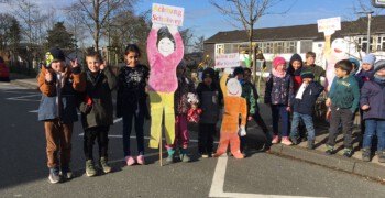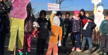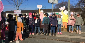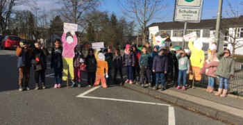 „Sensibilisieren durch Warnhinweise“ durch die gebastelten Aufsteller erhoffen sich die Kinder der Froschklasse etwas mehr Rücksicht auf ihrem Schulweg. In der Vergangenheit konnte nämlich häufig beobachtet werden, dass gerade in den Morgenstunden, wenig Rücksicht auf die Schulkinder genommen wurde.